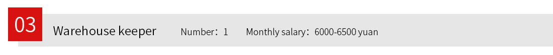 Junior high school above culture, 45 years old the following, have good communication skills, writing clear. Can bear hardships and stand hard work, adapt to shift work 12 hours.